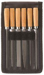 6-delig, in kunststoffen etui, DIN 7283. Inhoud: van elk 1 vijl in blok, vlakspits, halfrond, driekant, vierkant, rond.